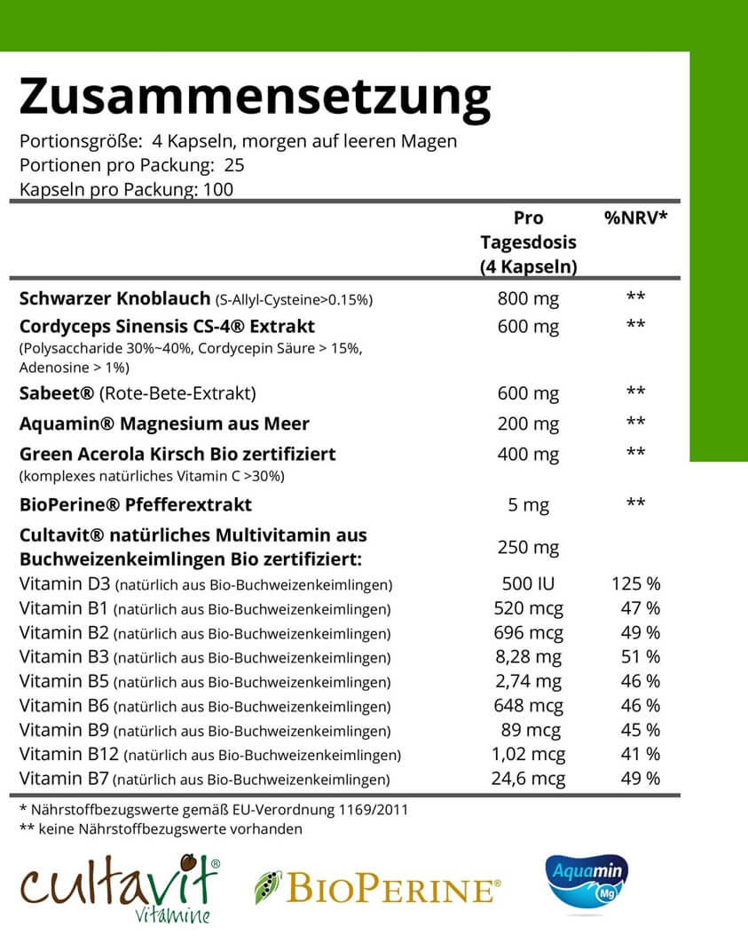 Nahrungsergänzungsmittel dürfen nicht als Ersatz für eine ausgewogene, abwechslungsreiche Ernährung und eine gesunde Lebensweise verwendet werden. Die angegebene empfohlene tägliche Verzehrmenge darf nicht überschritten werden.Geschlossen, kühl, trocken, lichtgeschützt und außerhalb der Reichweite von kleinen Kindern lagern. Für Schwangere, Stillende und Kinder nicht geeignet.