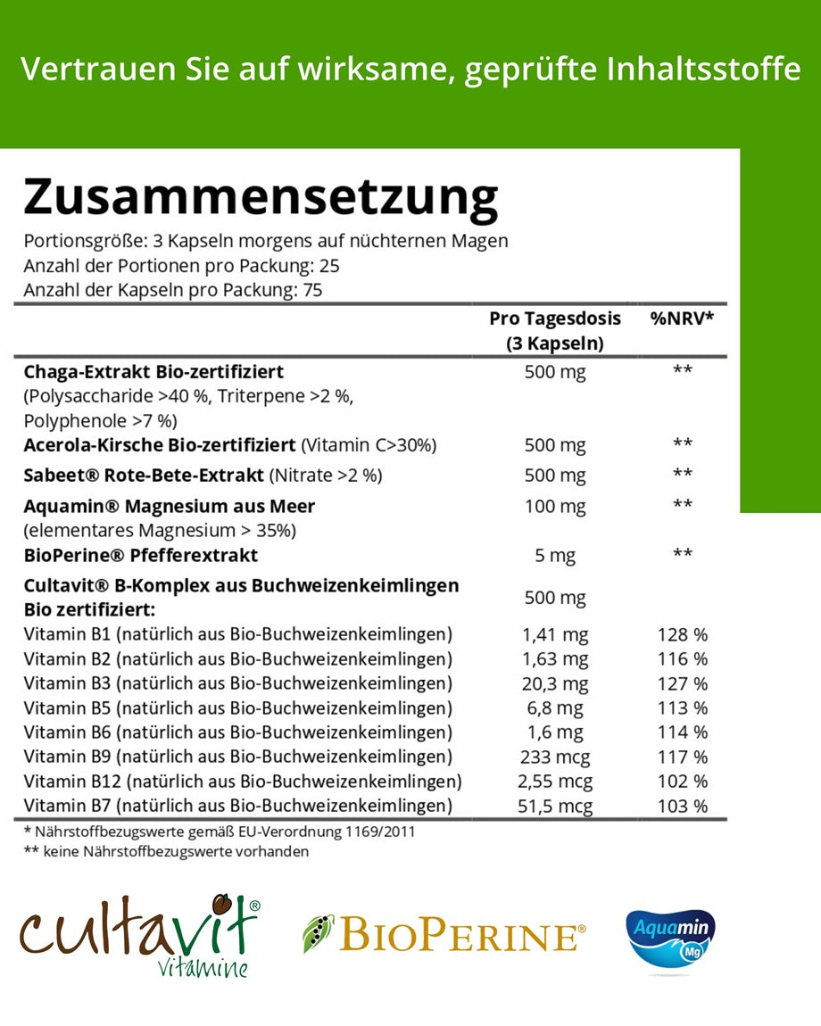 Mit Beta‑Glucanen aus Chaga und natürlichem Vitamin C aus Acerola wird Ihr Immunsystem aktiviert und oxidativer Stress reduziert. Das schützt Ihre Zellen vor vorzeitiger Alterung und stärkt die Abwehrkräfte.