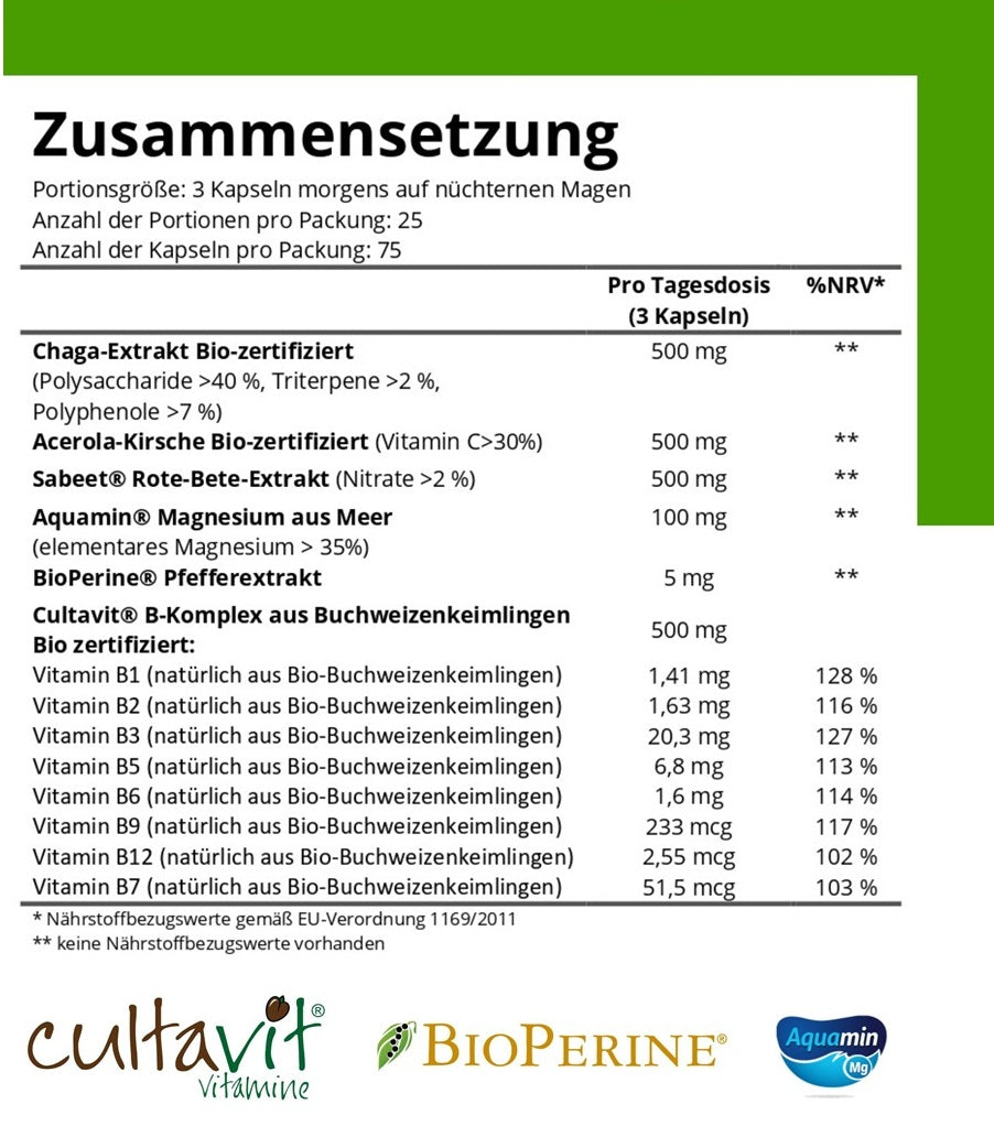 Nahrungsergänzungsmittel dürfen nicht als Ersatz für eine ausgewogene, abwechslungsreiche Ernährung und eine gesunde Lebensweise verwendet werden. Die angegebene empfohlene tägliche Verzehrmenge darf nicht überschritten werden.Geschlossen, kühl, trocken, lichtgeschützt und außerhalb der Reichweite von kleinen Kindern lagern. Für Schwangere, Stillende und Kinder nicht geeignet.