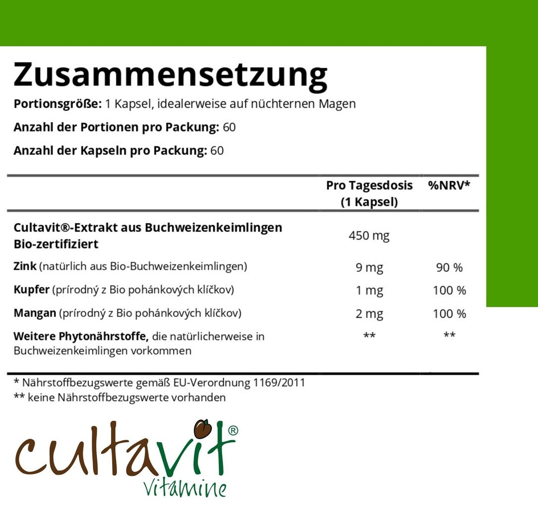 PANAKEYA® Natural Zinc enthält Cultavit®, ein 100 % reines Naturprodukt mit einem hohen Gehalt an natürlichem Zink, Kupfer, Mangan und weiteren Nährstoffen, die auf natürliche Weise in Buchweizensprossen vorkommen.
